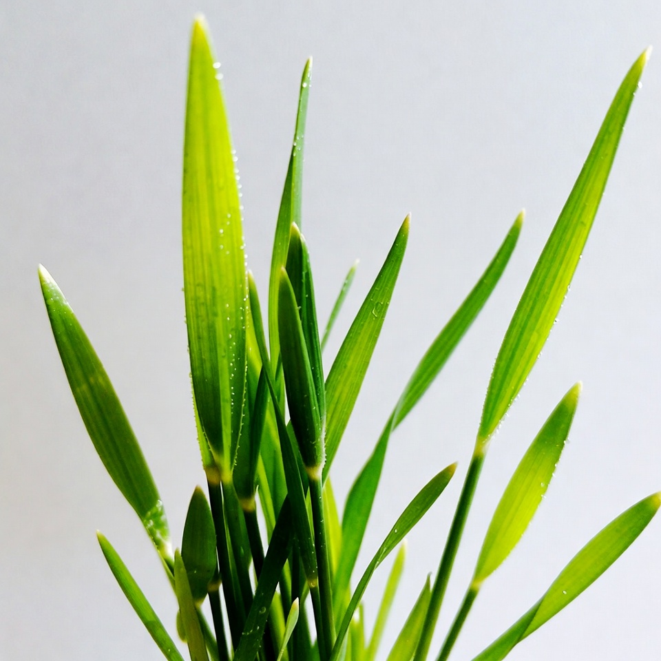 A cluster of fresh green grass blades with pointed tips stands upright against a plain white background. The blades are slender and slightly dewy, arranged in a bunch. They exhibit vibrant green hues with subtle yellow tinges at the edges.