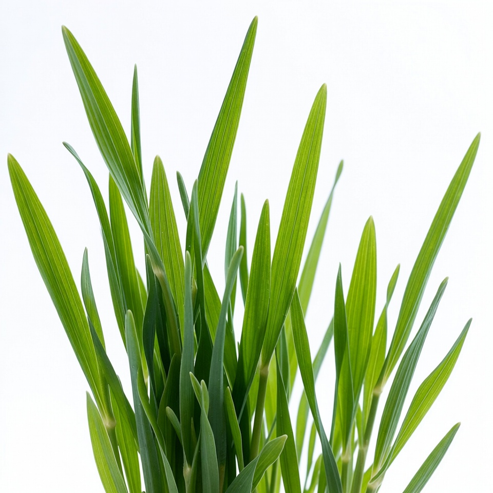 A cluster of vibrant green grass blades stands upright against a plain white background. The blades are long, slender, and slightly curved, showing fresh growth. They are densely packed together, creating a natural bunch.