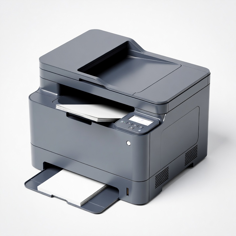 3D render, control panel, copy machine, digital display, gray printer, inkjet printer, isolated background, laser printer, multifunction printer, office equipment, office printer, paper tray, printing machine, scan device, white paper, printer