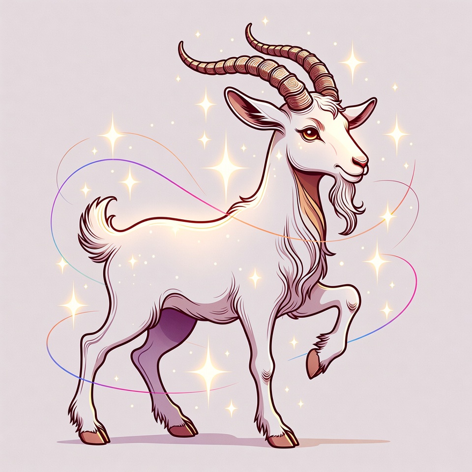 A stylized white goat with large curved horns stands on a light purple background. It features golden eyes, a flowing beard, and a fluffy tail, surrounded by swirling rainbow lines and sparkling stars. The artwork has a vibrant, cartoonish style with glowing highlights.