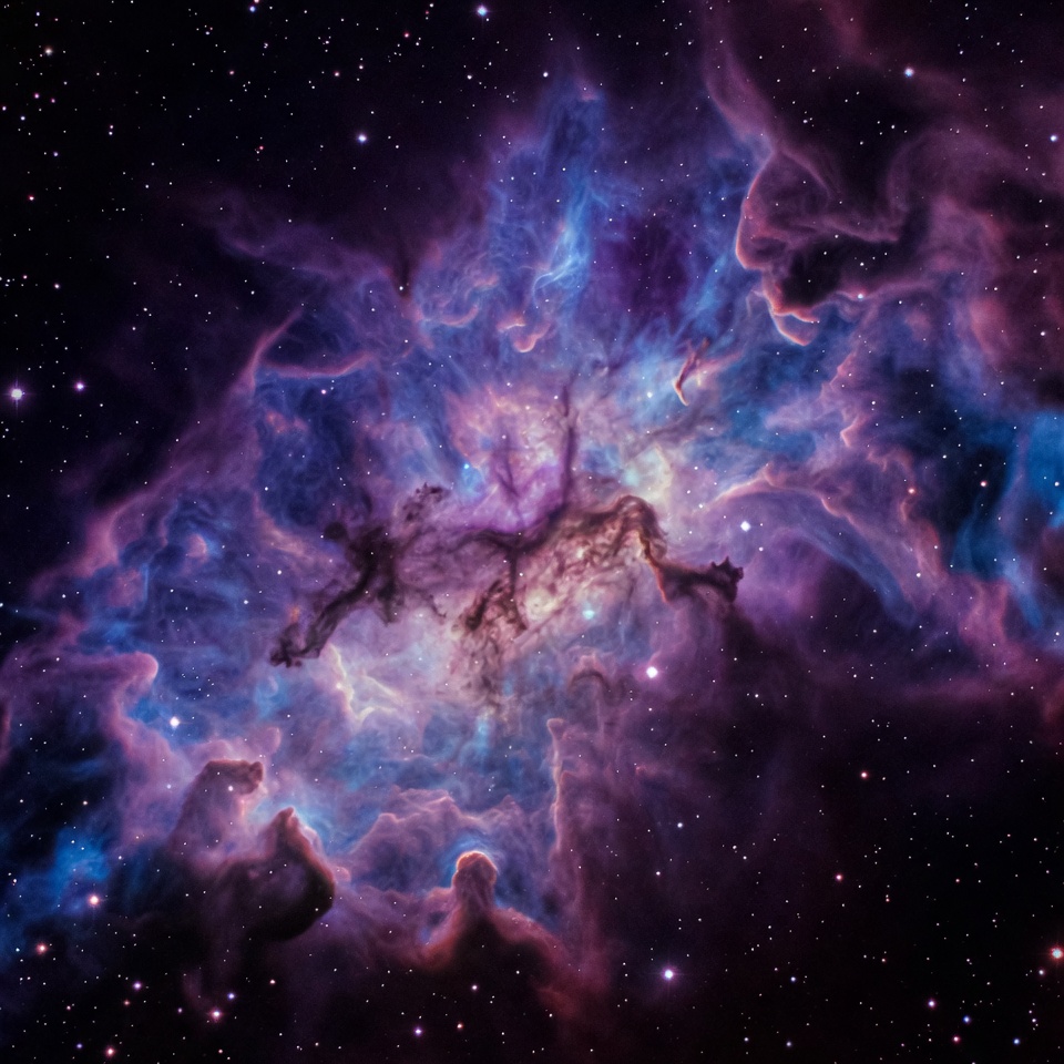 The Crab Nebula features intricate clouds of purple, blue, and pink gas swirling in a cosmic expanse. Bright stars dot the surrounding dark space, highlighting the nebula's glowing filaments and turbulent structure. Detailed textures reveal gaseous tendrils extending from the central supernova remnant.