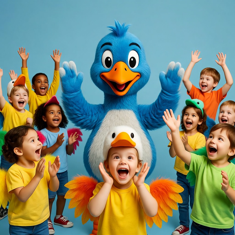 A large blue cartoon duck mascot with orange beak and wings stands on a blue background, surrounded by a diverse group of young children clapping and cheering excitedly. The children, wearing colorful t-shirts and some with feather hats, raise their hands in joy. The mascot poses dynamically with arms outstretched amid the happy kids.