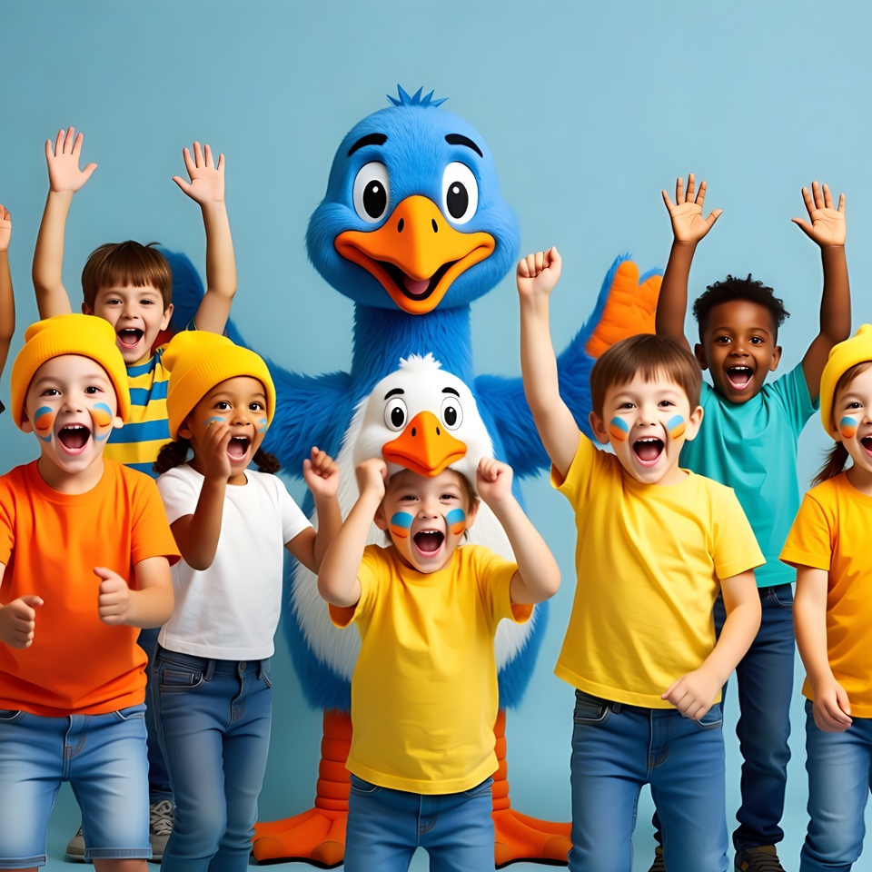 A group of diverse young children in colorful t-shirts and hats cheers excitedly with arms raised around a large blue bird mascot. The mascot, with orange beak and feet, stands in the center on a solid blue background. The children, including Black, White, and Multiracial kids, wear face paint and jeans.