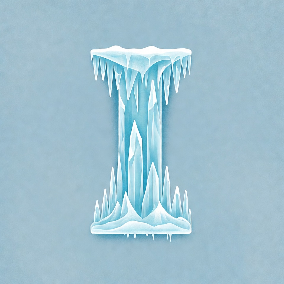 A digital illustration of the capital letter 'I' made entirely from translucent blue ice. Icicles hang from the top and bottom edges, with jagged ice formations along the sides. It is centered on a light blue gradient background.