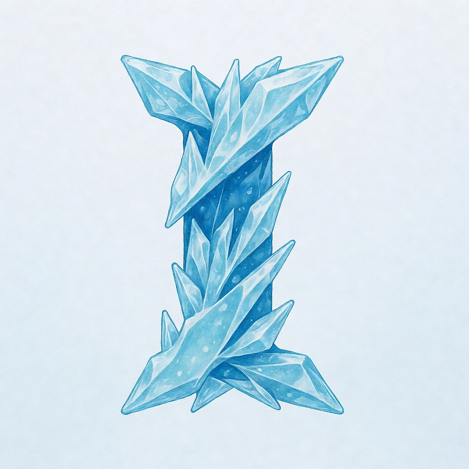 A stylized letter 'I' is depicted as a cluster of translucent blue ice crystals with sharp, jagged edges. The illustration features sparkling highlights and a transparent, crystalline texture against a plain white background. It has a fantasy-inspired design with pointed spikes extending from the central form.
