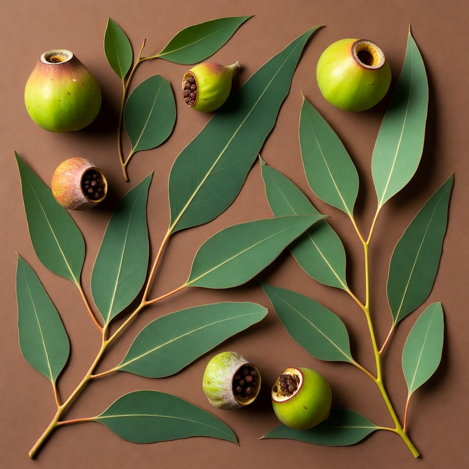 A flat lay arrangement of green eucalyptus leaves and various gumnuts on a brown background. The gumnuts are shown whole, split open revealing seeds, in green and reddish-brown colors. Leaves are arranged symmetrically around the seed pods.