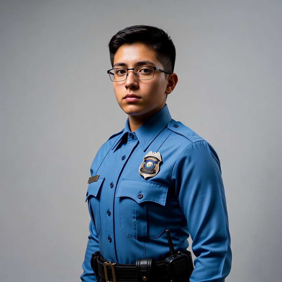 Latino, blue uniform, duty belt, glasses, gray background, law enforcement, male, man, police badge, portrait, radio, serious expression, short black hair, uniform shirt, young, police officer