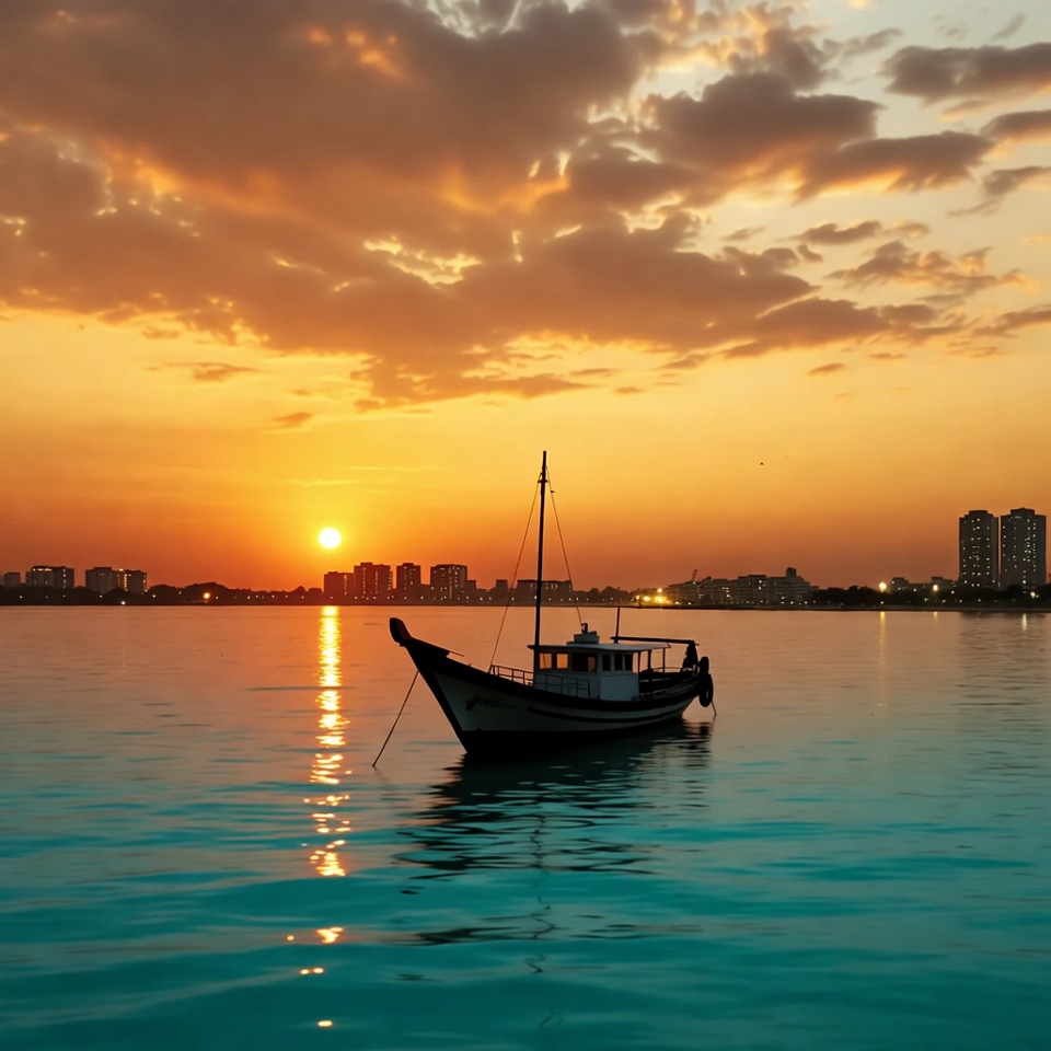 A traditional wooden dhow boat with sails floats calmly on turquoise water during sunset. The vibrant orange sun dips behind modern high-rise buildings on the distant shoreline. Dramatic clouds reflect warm hues in the sky and shimmering reflections on the water.