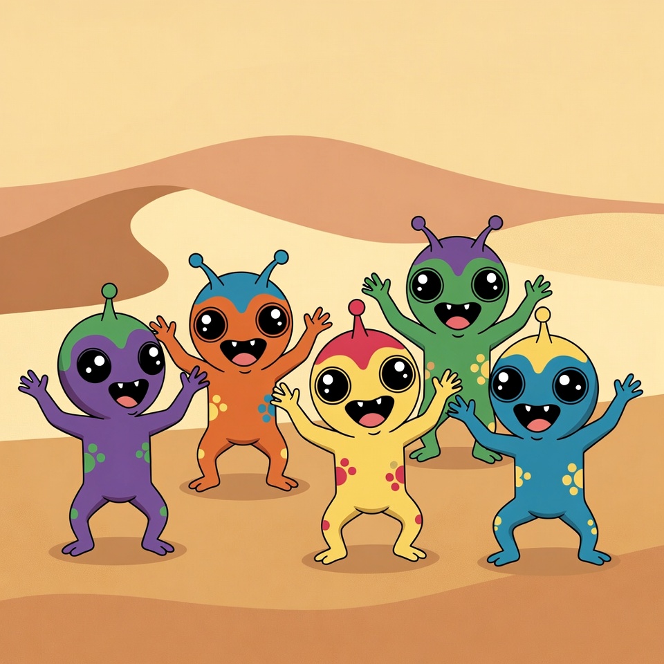 Colorful aliens waving in desert