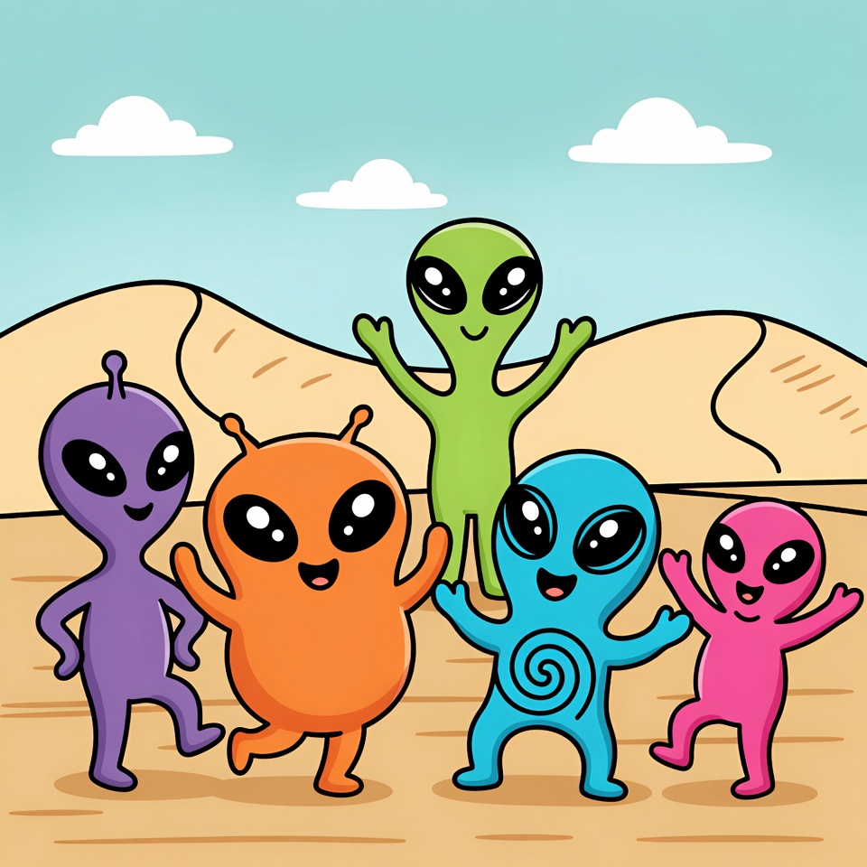Colorful cartoon aliens dancing in desert