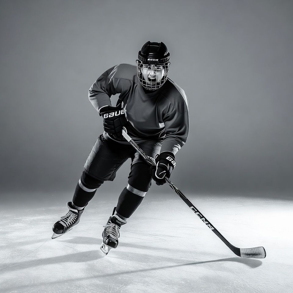 White, action pose, dynamic motion, face cage, gloves, helmet, hockey equipment, hockey stick, ice hockey, ice rink, jersey, male, player action, puck, shorts, skates, skating, sports gear, studio shot, hockey player