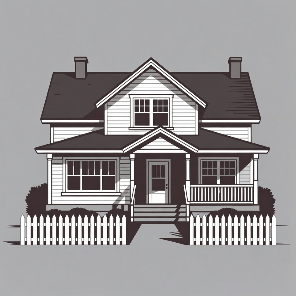 A detailed line art illustration of a two-story white house with a gabled roof and two chimneys. The house features large windows, a covered front porch with steps, and a white picket fence surrounding it. Bushes flank the fence on a plain gray background.