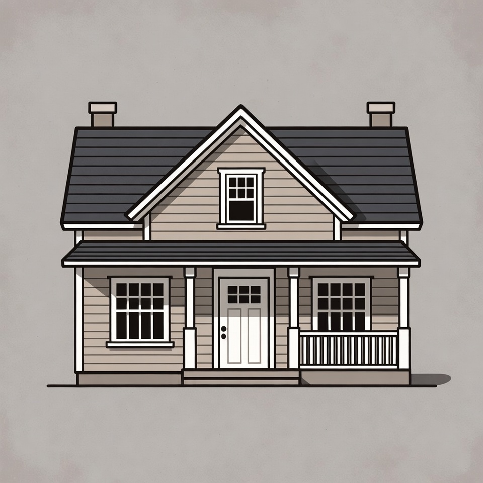 A detailed line art illustration of a cozy two-story house with beige siding and dark gray roof. It features a covered front porch supported by white columns, multiple windows, and a central white door. The house is centered on a plain gray background with subtle shadows.