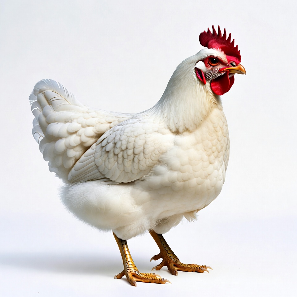 A white hen with a bright red comb and wattle stands on a plain white background. Its feathers are fluffy and detailed, with yellow legs and beak. The bird faces slightly to the side with a direct gaze.