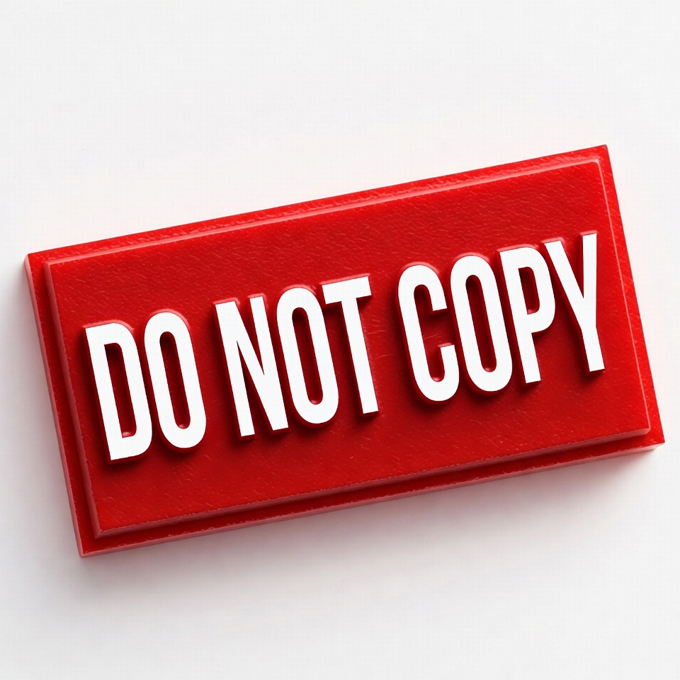 3D sign, alert, bold letters, copyright sign, isolated background, no copy, notice, prohibition sign, rectangular sign, red label, red sign, signage, warning sign, white background, white text, do not copy