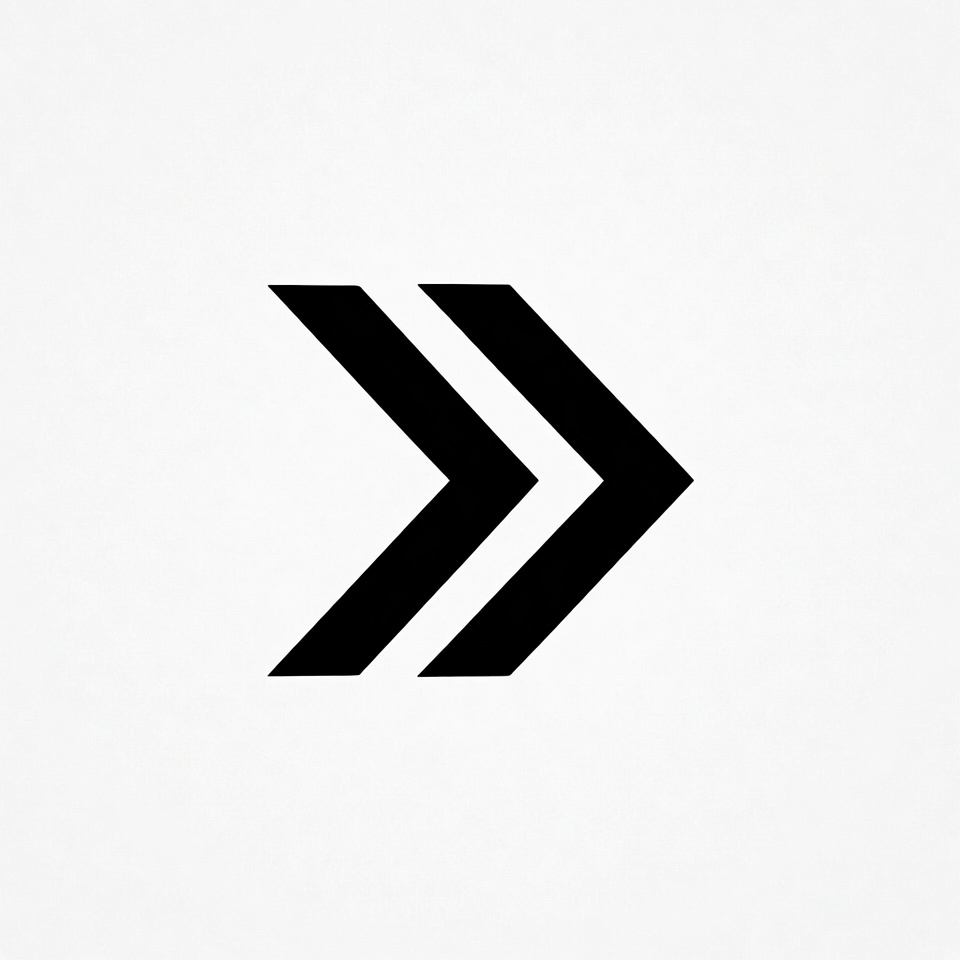 A simple black double arrow icon points to the right on a white background. The arrow features two parallel chevron shapes with bold, clean lines. It is a minimalist vector graphic suitable for UI elements.