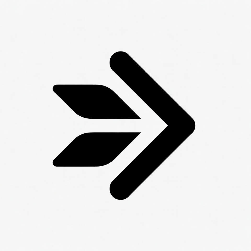 A simple black line icon of a right-pointing arrow on a white background. The arrow features a thick shaft with flared, leaf-like fletching on the back. It has a modern, minimalist design with clean curves and sharp points.