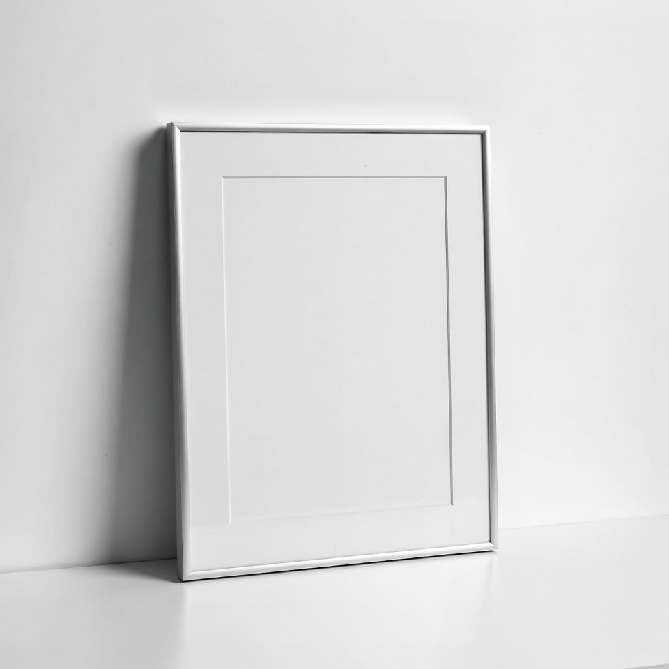 art frame, blank frame, display frame, isolated background, leaning frame, mockup frame, modern frame, photo frame, picture frame, poster frame, rectangular frame, silver frame, wall frame, white background, white wall, empty frame