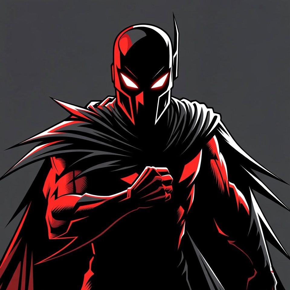 DC comics, black cape, clenched fists, clipart style, comic art, dark background, dynamic pose, gothic hero, graphic art, illustration, male, masked hero, muscular man, red Batman, red eyes, superhero, vigilante, Batman