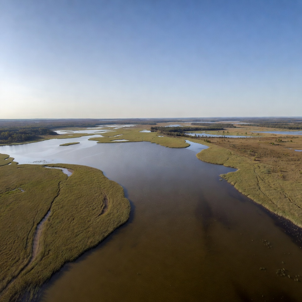 aerial drone, blue sky, bog, estuary, forests, grass, grassy banks, green marsh, islands, landscape, marsh, natural landscape, nature, outdoors, panorama, river, river bend, river delta, scenery, swamp, water, waterways, wetland, wilderness, aerial view
