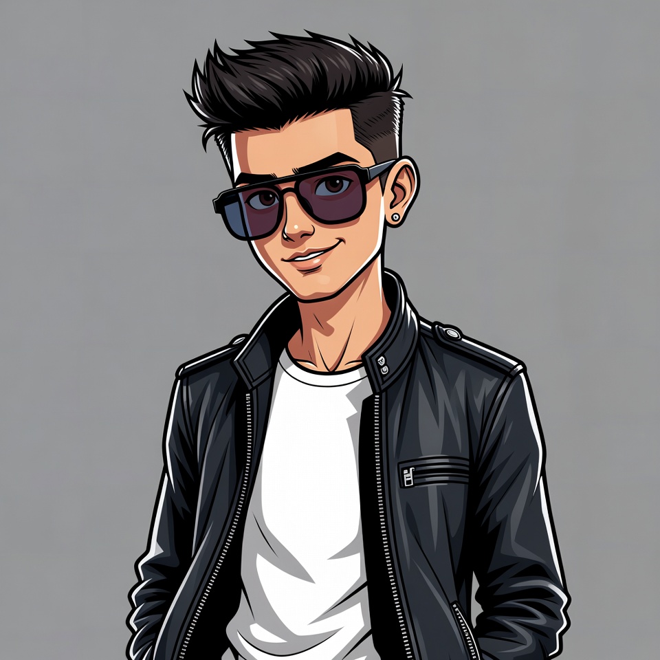 A young man with spiky black hair and an undercut hairstyle smiles confidently while wearing dark sunglasses and a small earring. He is dressed in a black leather jacket over a white t-shirt, with hands in pockets. The illustration features him against a plain gray background.