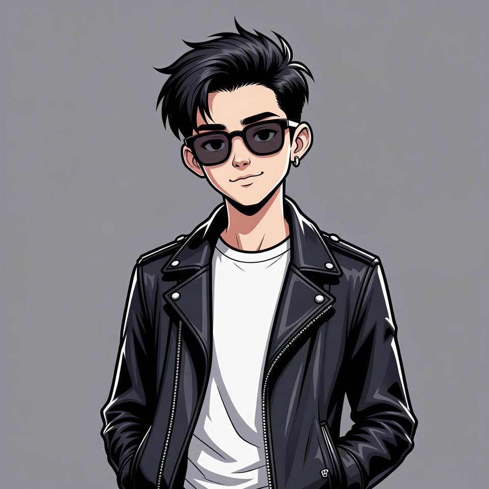 Asian, black hair, cartoon, character design, confident pose, cool guy, earring, fashion, hands in pockets, illustration, isolated background, leather jacket, male, man, portrait, smiling, streetwear, stylish, sunglasses, white t-shirt, young man, anime