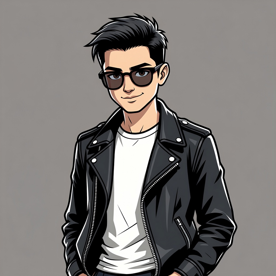 A young Asian man with short black hair and dark sunglasses stands confidently against a gray background. He wears a black leather jacket over a white t-shirt. The image is a vibrant digital illustration with bold outlines.