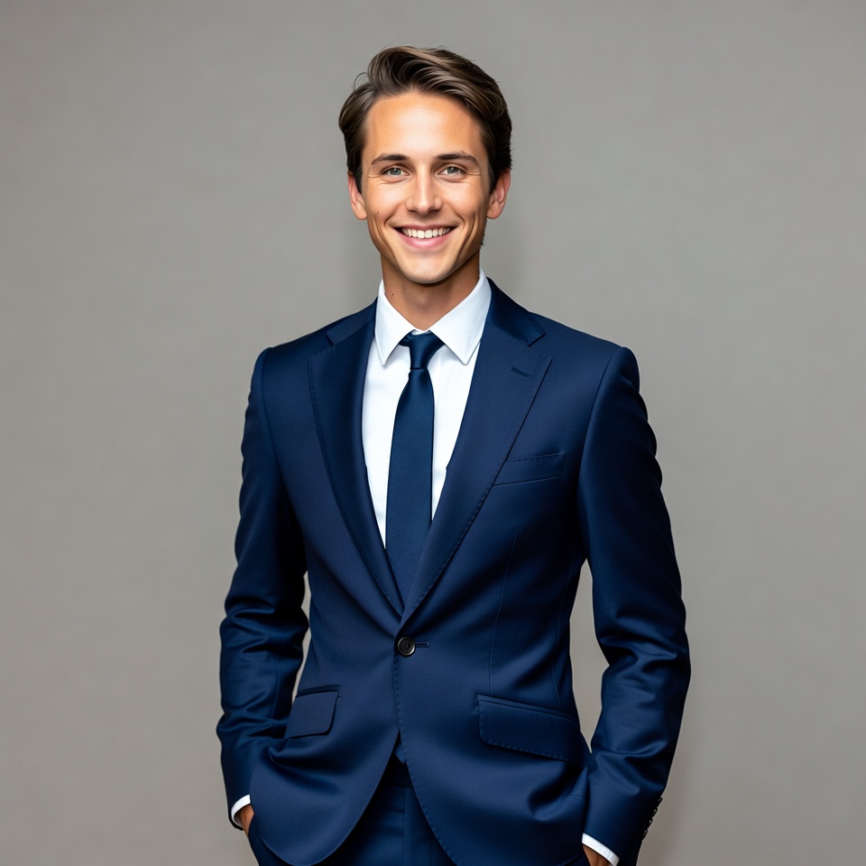 A young White man with short brown hair smiles confidently at the camera while standing against a gray background. He wears a navy blue suit, white dress shirt, and navy tie, with hands casually in his pockets. His posture is relaxed yet professional.