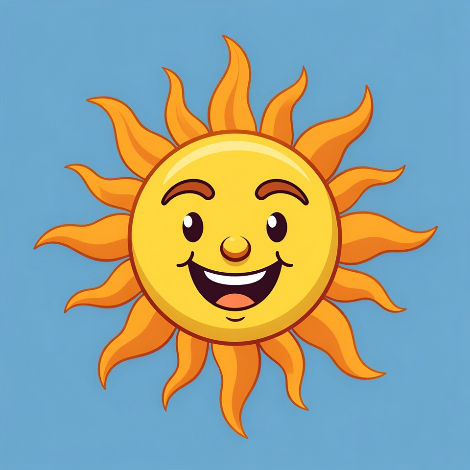 A cheerful cartoon sun with a yellow face and orange rays smiles happily on a blue background. It has big eyes, arched eyebrows, and a wide grin. The illustration is vibrant and isolated.