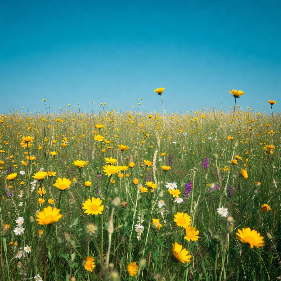 A vibrant field of yellow flowers sways gently amidst green grass and scattered white and purple wildflowers. The scene is set against a clear blue sky. The flowers dominate the foreground with tall stems reaching upward.