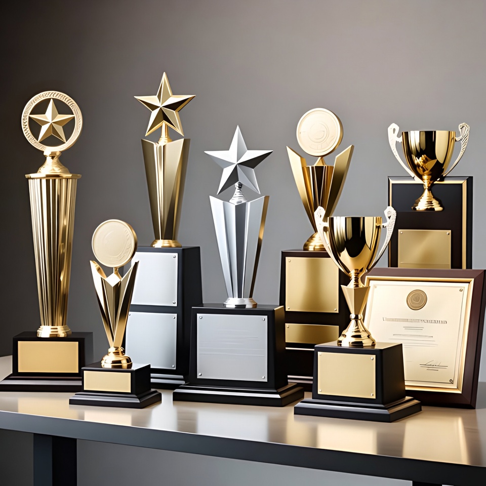 achievement award, award display, awards, black base, cup trophy, engraved plaque, gold trophies, isolated background, metallic trophies, plaque award, recognition award, silver trophies, sports trophy, star trophy, table display, trophy collection, winner trophy, trophies