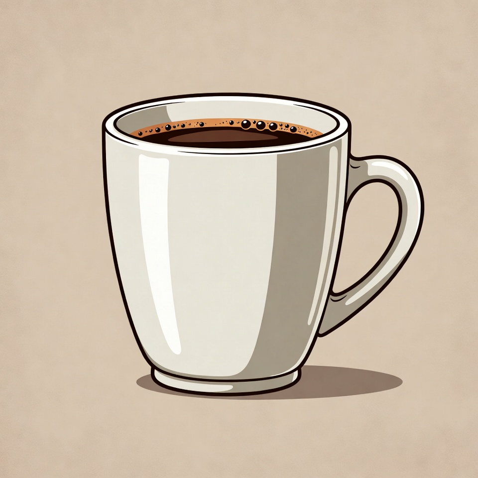 A white ceramic mug filled with dark steaming coffee sits on a beige background. The mug features a simple handle and subtle shading for a three-dimensional effect. Fine bubbles form along the coffee's surface.