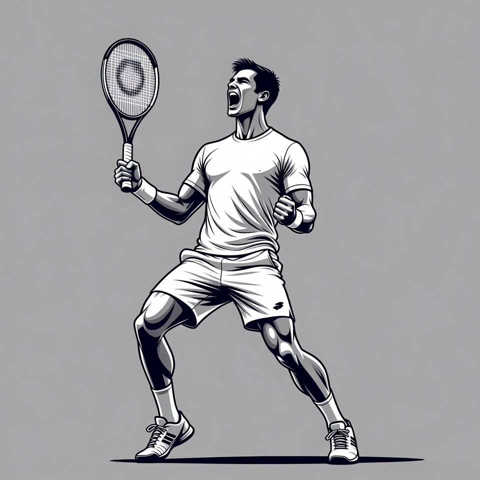 White, arms raised, athlete, celebrating, champion, dynamic pose, energetic, grayscale, illustration, isolated background, male, man, muscular, powerful, racket, shorts, sneakers, sports, tennis, tennis racket, vector art, victory, white shirt, yelling, tennis player