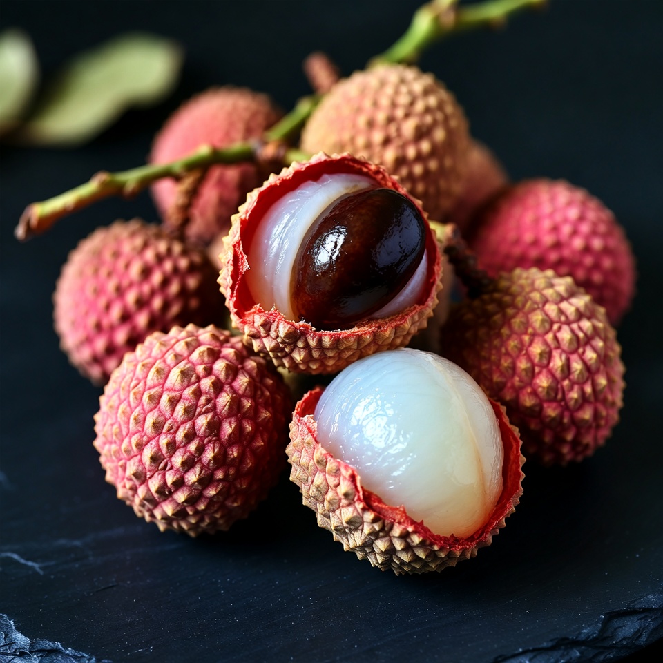 A cluster of fresh red lychees with spiky skins sits on a black slate surface. Several pods are split open, revealing white translucent flesh and dark seeds inside. Green leaves and stems add a natural touch to the arrangement.