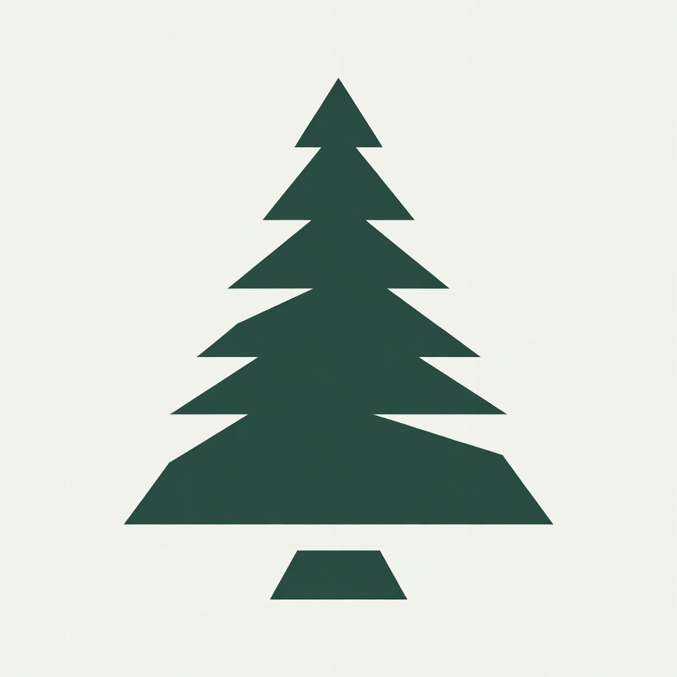 A simple geometric illustration of a pine tree in dark green on a light gray background. The tree features triangular layers forming its branches and a small rectangular base. It has a minimalist, clipart style design.
