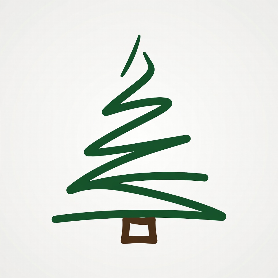 A minimalist line drawing of a Christmas tree in green on a white background. The tree features swirling branches and a small brown trunk at the base. It has a simple, hand-drawn style with clean outlines.