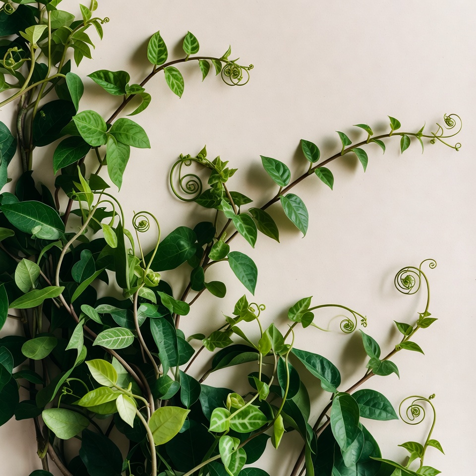 Fresh green vine leaves and curly tendrils are arranged against a plain white background. The plant features broad leaves, slender stems, and distinctive spiraled shoots. The composition emphasizes the vibrant greenery and natural curves.