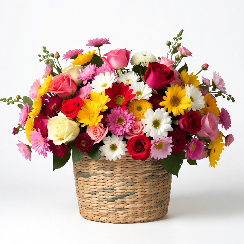 bouquet, carnations, colorful flowers, daisies, floral arrangement, flower basket, green foliage, isolated background, pink flowers, red flowers, roses, sunflowers, vibrant bouquet, white flowers, wicker basket, yellow flowers, flowers