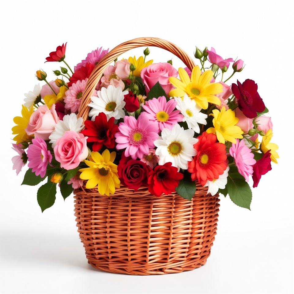 A wicker basket overflows with a vibrant bouquet of multicolored flowers including roses, daisies, and chrysanthemums in shades of red, pink, yellow, and white. The flowers feature lush green leaves and are arranged densely. The basket sits on a plain white background.