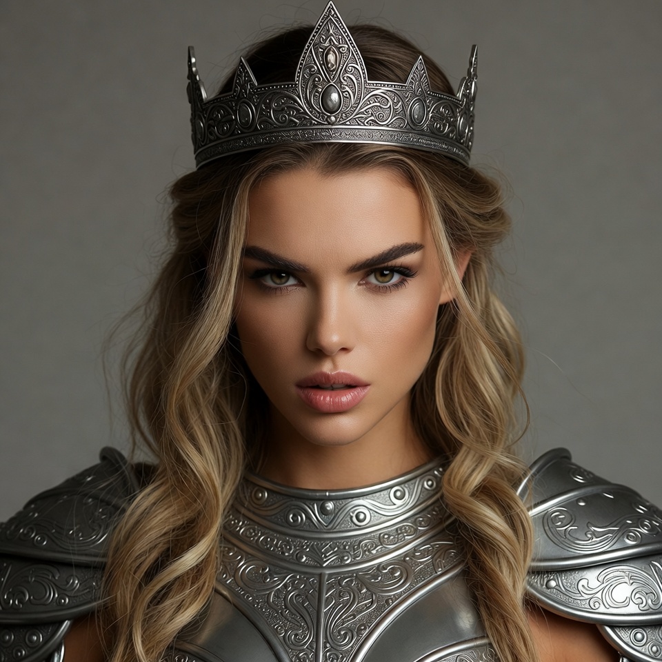A young woman with long blonde hair wears an ornate silver crown and detailed metallic armor. She has striking green eyes, full lips, and a direct gaze at the viewer. Her hair is styled in loose waves framing her face against a plain background.