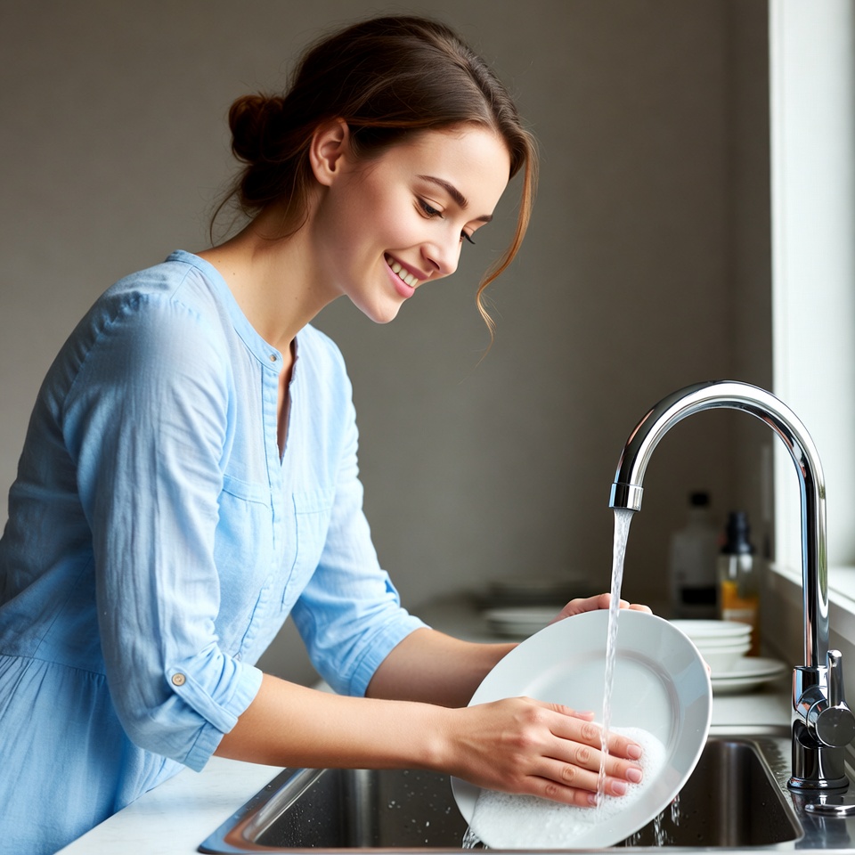 A smiling young woman with brown hair tied in a bun washes a white plate under running water in a kitchen sink. She wears a light blue long-sleeved top and stands in front of a stainless steel sink with a window nearby. Stacks of clean dishes and a bottle sit on the counter beside her.