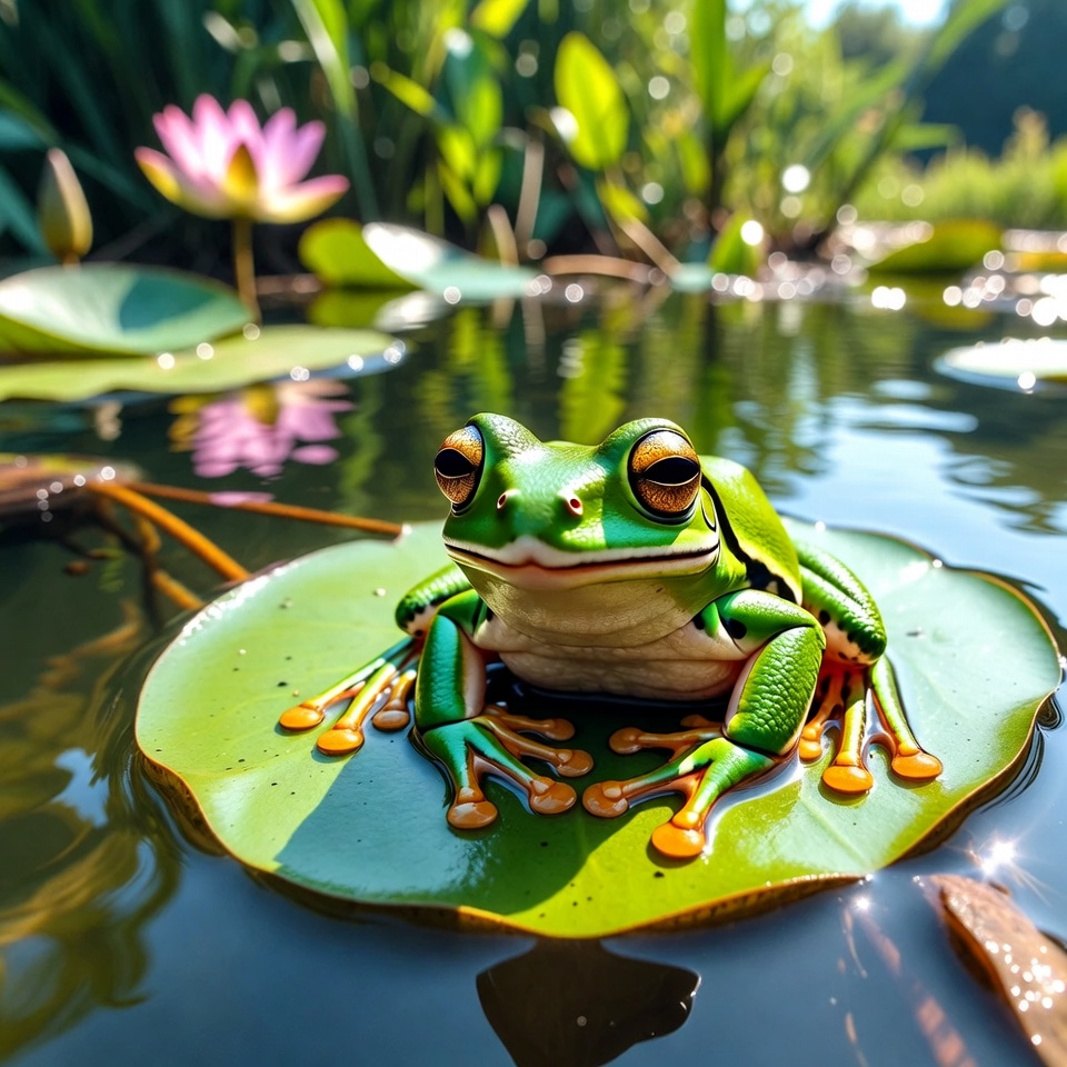 A vibrant green tree frog with large yellow eyes sits on a large green lily pad in a pond surrounded by lush green foliage and pink lotus flowers. Sunlight filters through the plants, illuminating the frog's orange toes and the reflective water surface. Additional lily pads and stems float nearby in the serene aquatic environment.