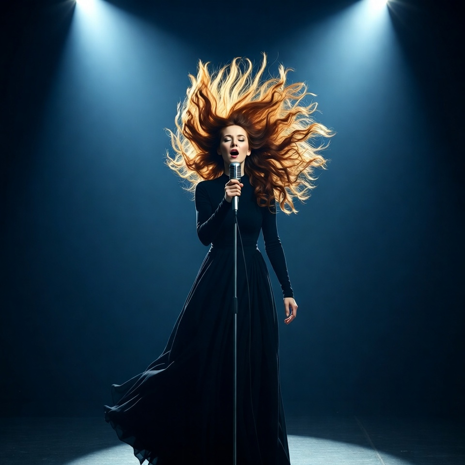 A woman with long red hair flowing dramatically sings into a microphone under bright spotlights. She wears a long black dress that flows as she performs on a dark stage. The spotlights create a dramatic blue lighting effect around her.