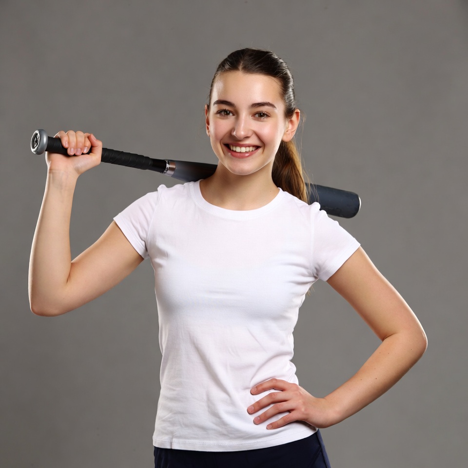 White, athletic pose, baseball bat, brown hair, confident expression, female, gray background, holding bat, ponytail, shorts, smiling, softball bat, sports equipment, studio photo, teenager, white t-shirt, young, girl