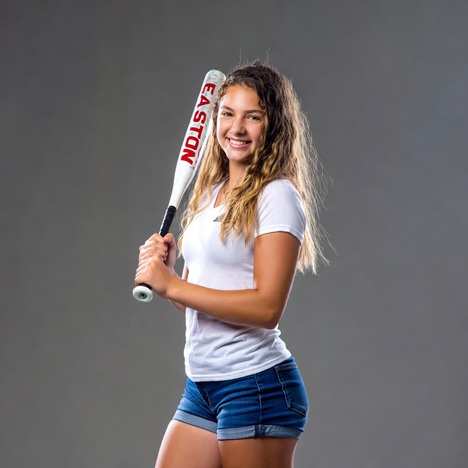 Easton bat, White, athletic girl, baseball bat, bat over shoulder, blue shorts, brown hair, confident pose, curly hair, denim shorts, female, gray background, holding bat, portrait, smiling girl, softball bat, softball player, sports equipment, white t-shirt, young woman, girl