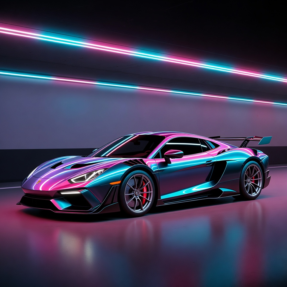 A sleek supercar with iridescent purple and pink paint gleams under vibrant neon lights on a racetrack. It features aerodynamic curves, a large rear wing, black accents, and glowing cyan rims. The scene is set against a dark background with purple-hued walls and reflective floor.