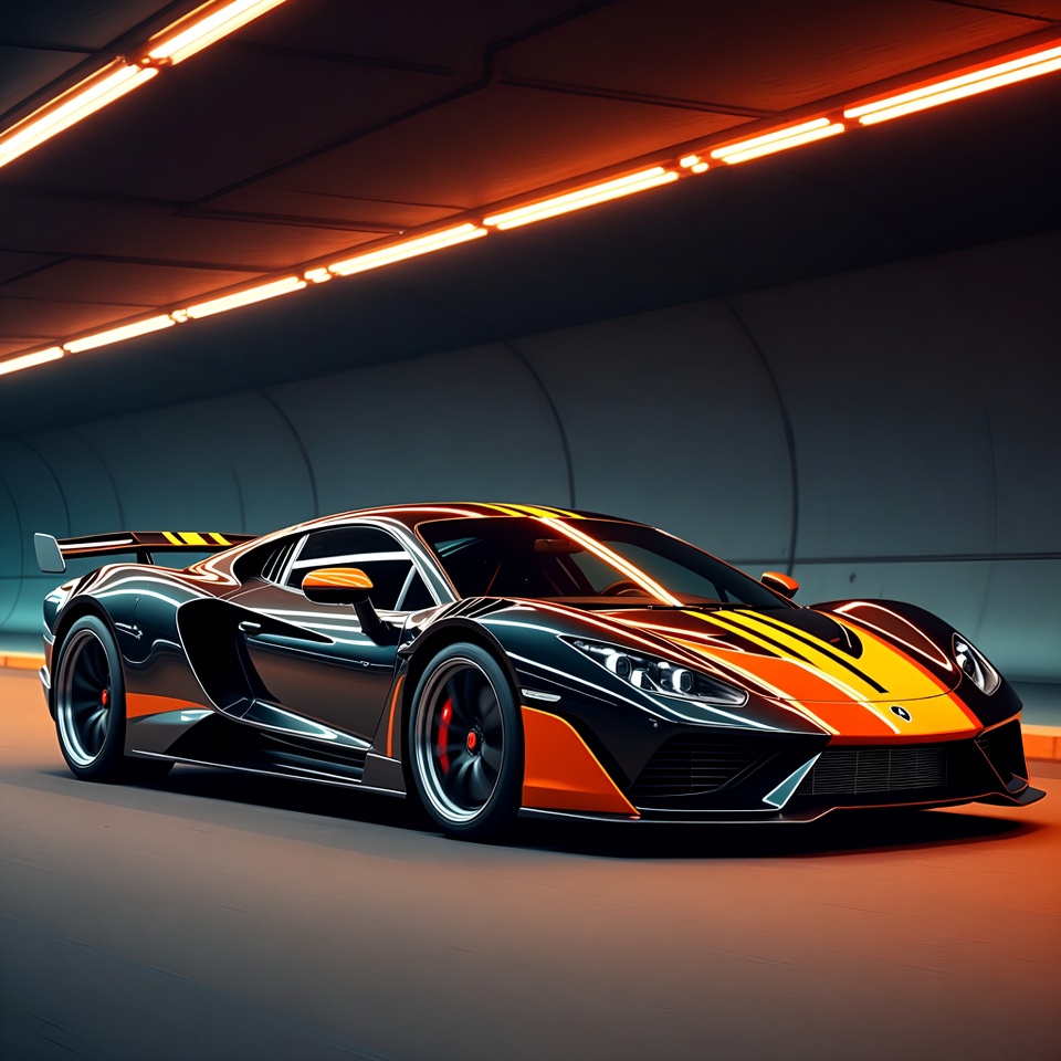 aerodynamic, automotive, black car, car design, dark background, futuristic car, glossy wheels, glowing lights, headlights, hypercar, illuminated tunnel, luxury car, modern car, neon lights, orange stripes, performance car, racing car, rear wing, red calipers, side view, speed, sports car, tunnel, vehicle, vents, supercar