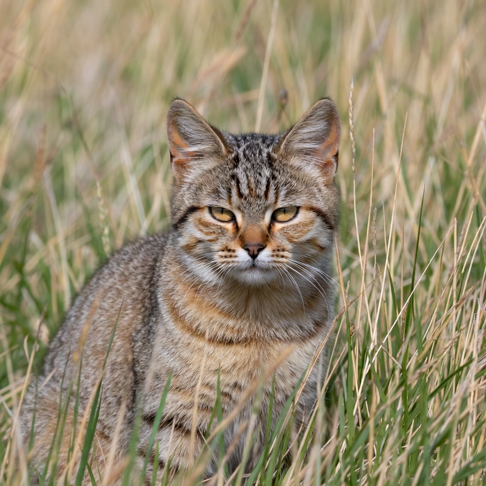animal, brown fur, cat, feline, field, grass, gray fur, nature, outdoors, perked ears, sitting cat, striped fur, tabby cat, tall grass, whiskers, wild kitten, yellow eyes, young cat, kitten