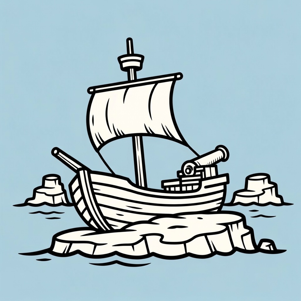 A simple line art illustration shows a wooden pirate ship with sails and a cannon perched on a large iceberg. Small icebergs float nearby in calm blue waters. The ship features a tall mast and detailed rigging in a cartoon style.