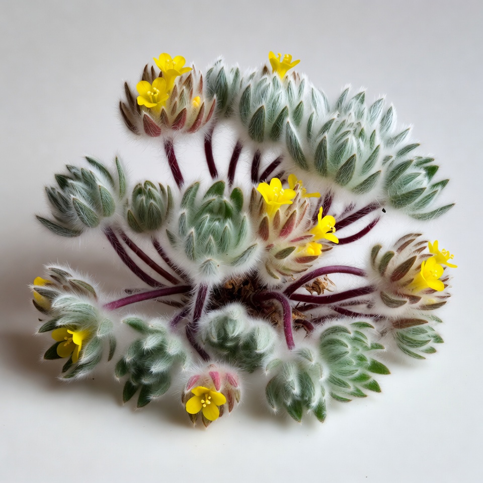A close-up of a cluster of small yellow flowers with fuzzy green and silver leaves on thin reddish stems. The plant is arranged in a dense bunch against a plain white background. Each flower features delicate petals and prominent stamens.